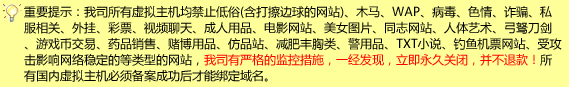[14] 我司的所有虚拟主机均禁止法轮功、木马、病毒、色情、诈骗、违反国家法律、涉及成人内容、私服、外挂、六 合 彩、垃圾邮件、纯下载等之类的网站,一经发现,立即永久关闭,并不退款!