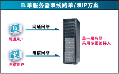 双线路机房基本解决了数据同步的问题,且能降低维护及硬件投入的费用。此类机房分为两种,一种是双线路单IP方案;另一种是双线路双IP方案。