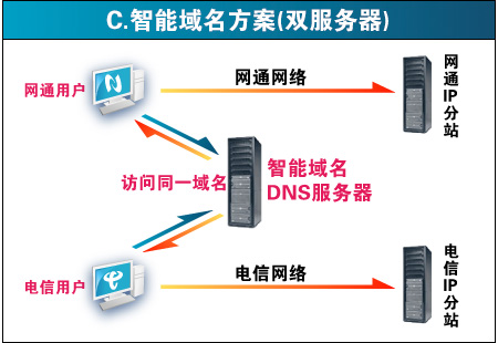 缺点:跟第一种方案一样,出多一倍的费用,并且“智能”解析域名在国内还不成熟,经常发生电信的用户访问时解析到网通ip的情况(因为ip数据库不准确)。